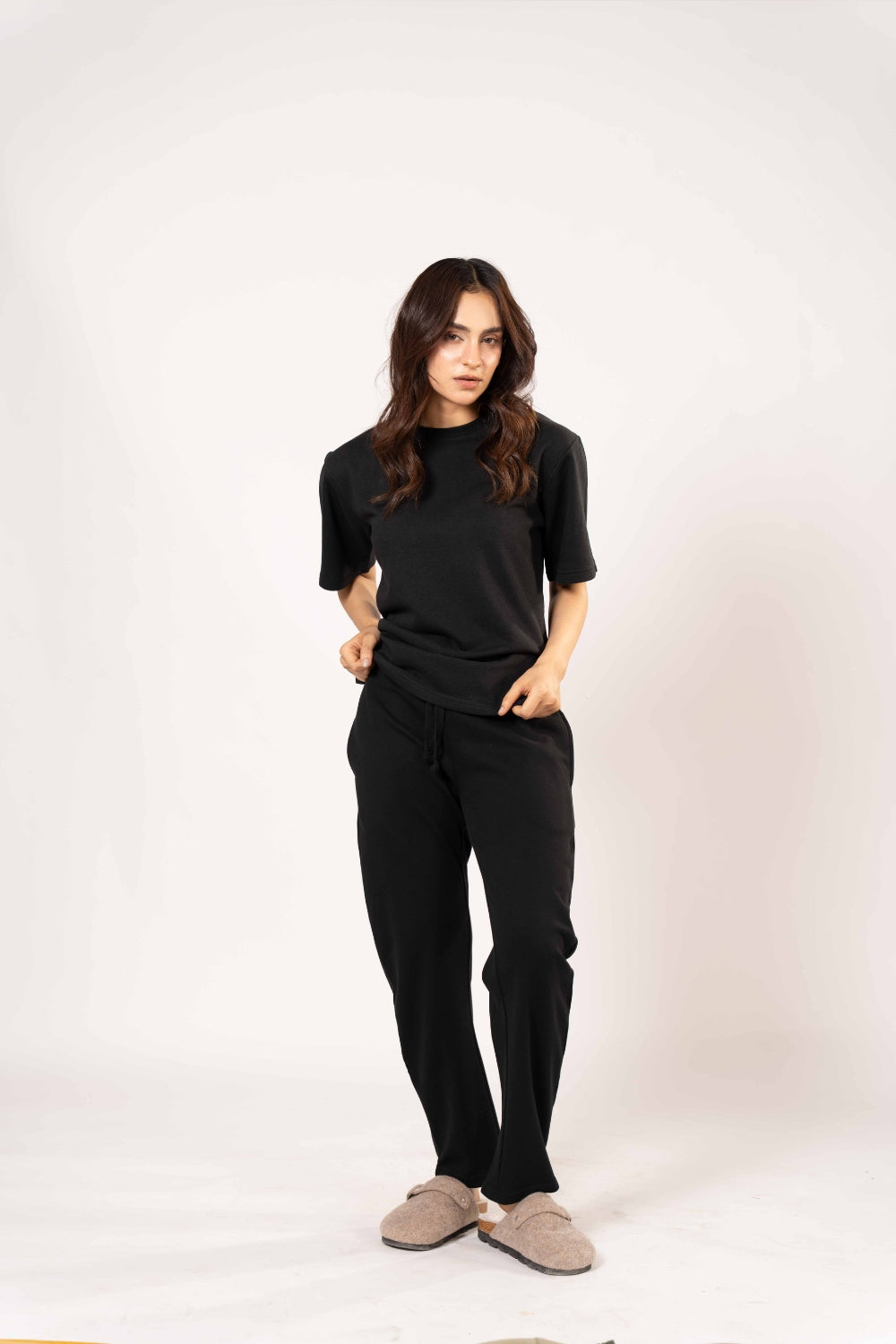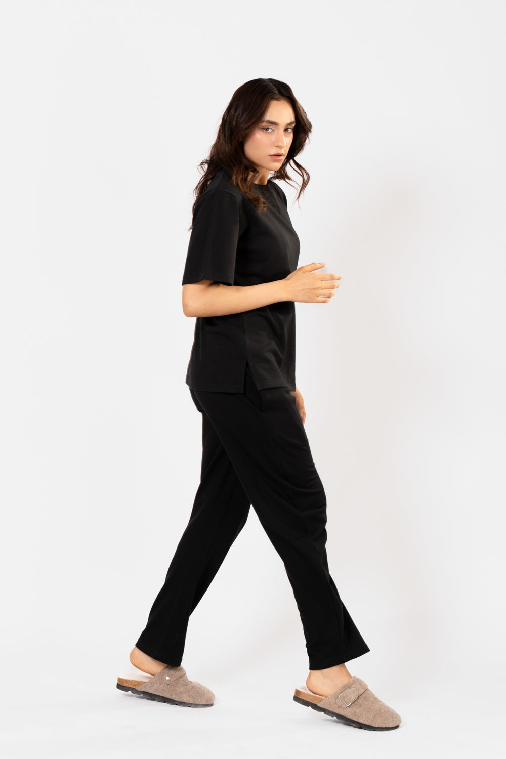 T-shirt made of soft, compact stretchy terry fabric featuring a round neck short length sleeves and side vent at the hem. Barrel trouser relaxed fit, side pocket elastic waist barrel.