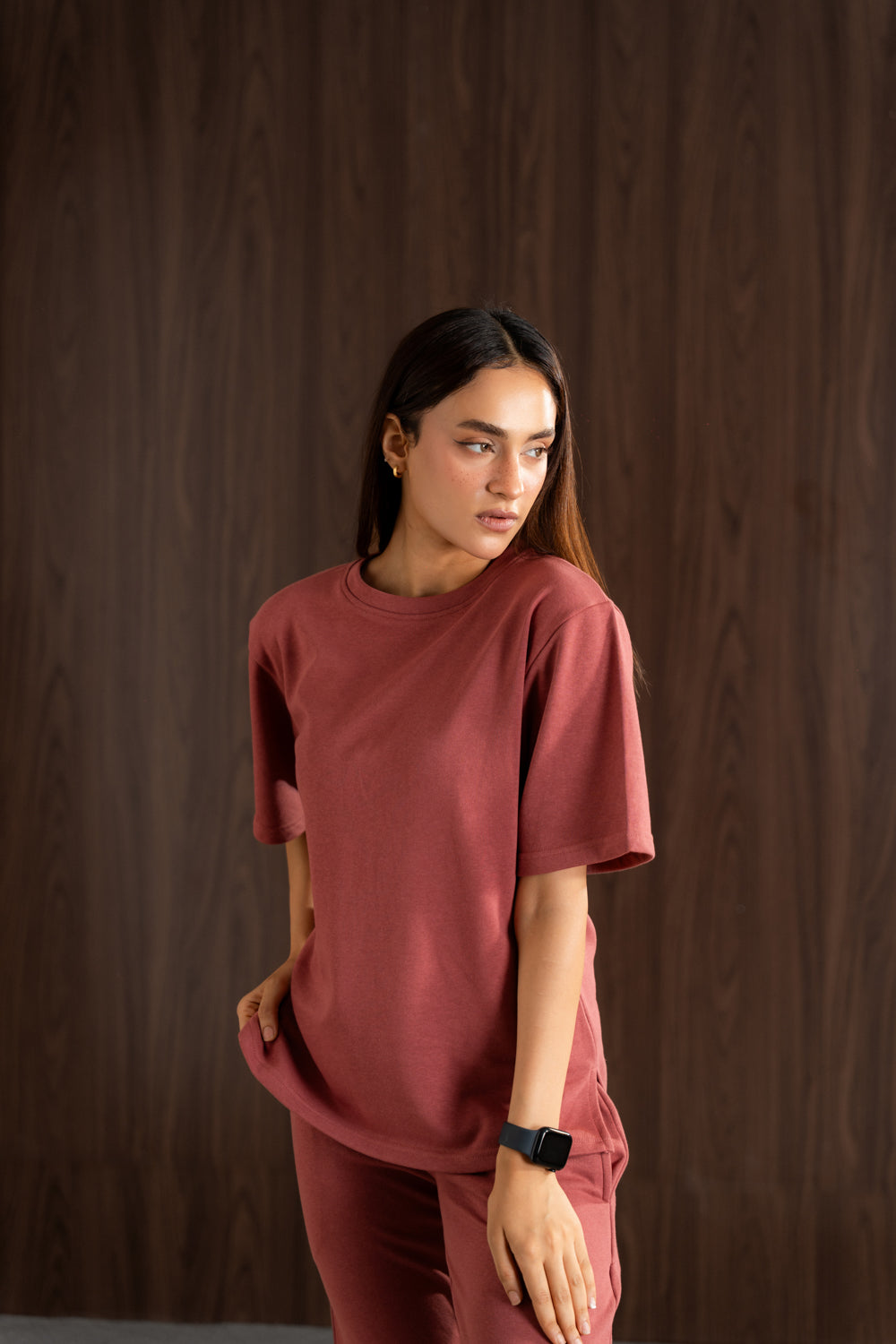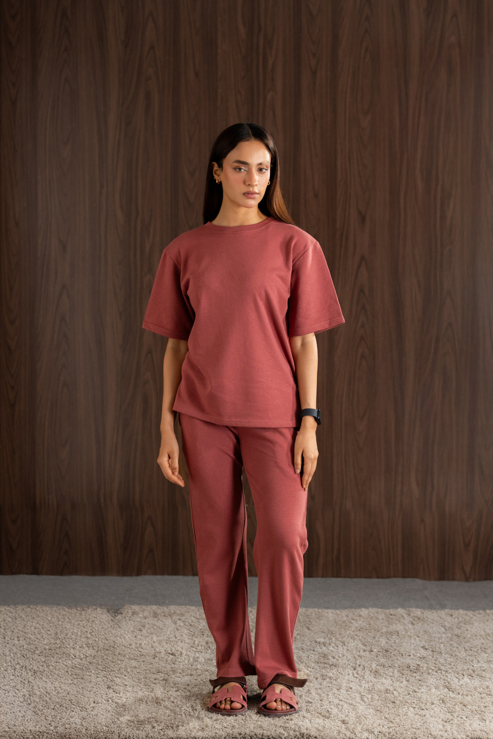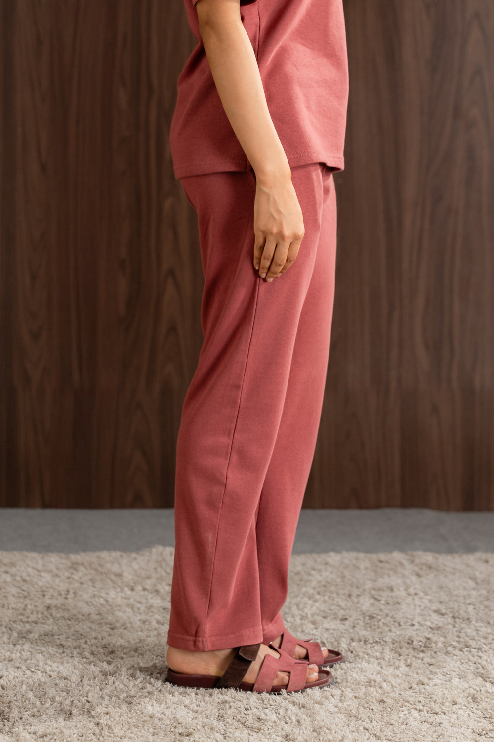 T-shirt made of soft, compact stretchy terry fabric featuring a round neck short length sleeves and side vent at the hem. Barrel trouser relaxed fit, side pocket elastic waist barrel. -        Relax fit The model is 5’6" (170 cm) and is wearing a size XS.