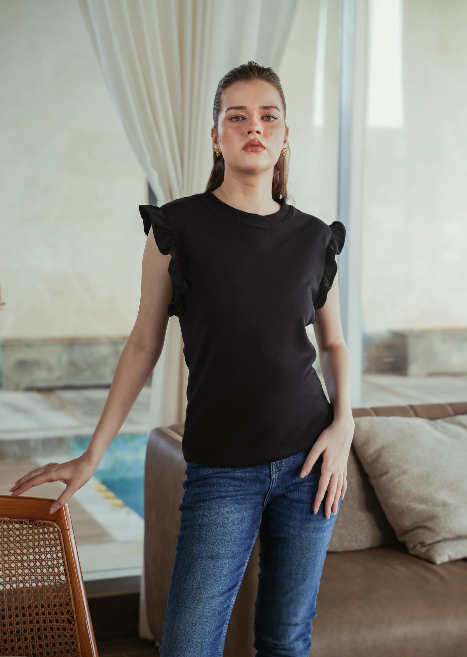 Soft, airy and breathable T-shirt made of 100% cotton round neckline and sleeveless with frills.