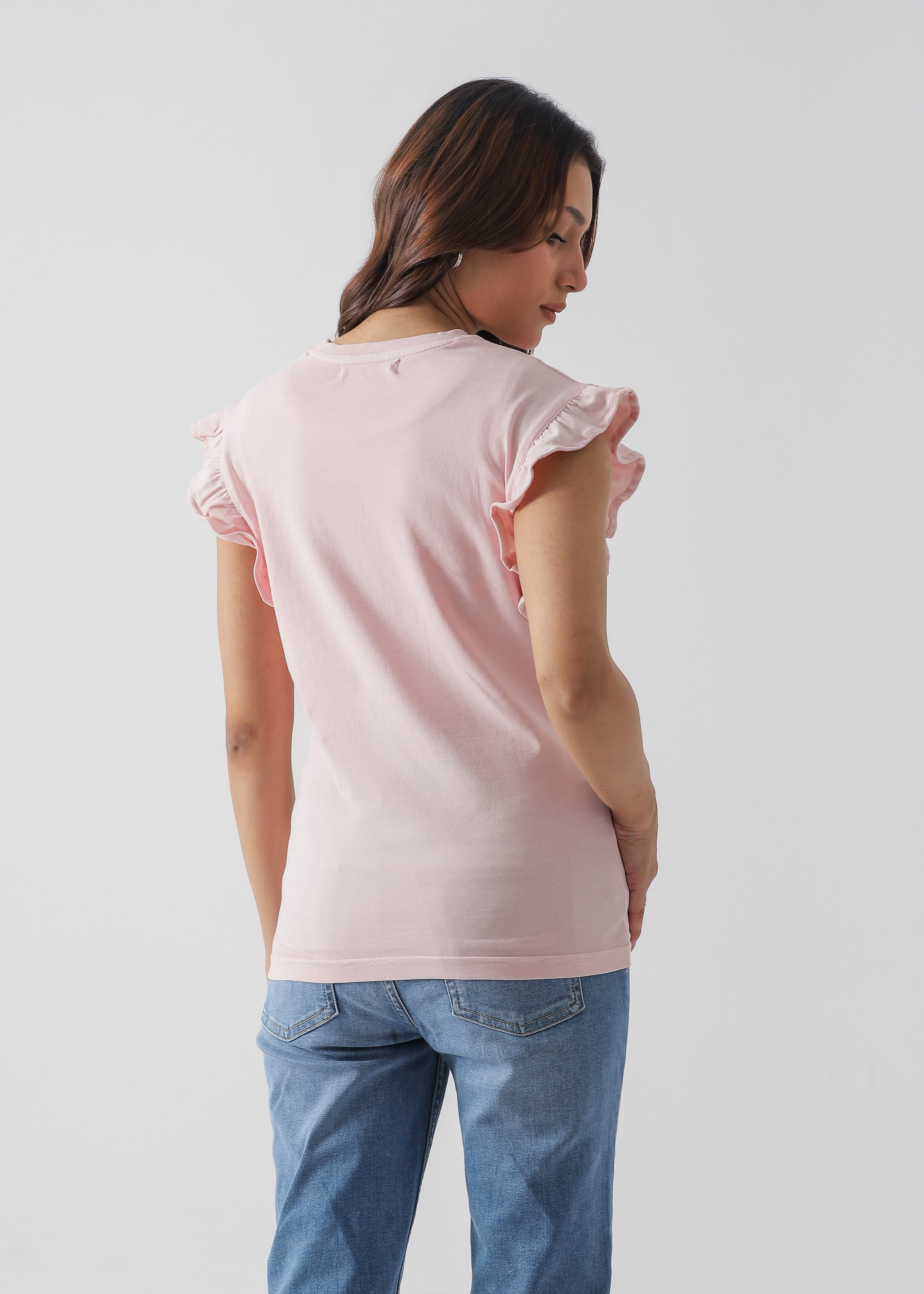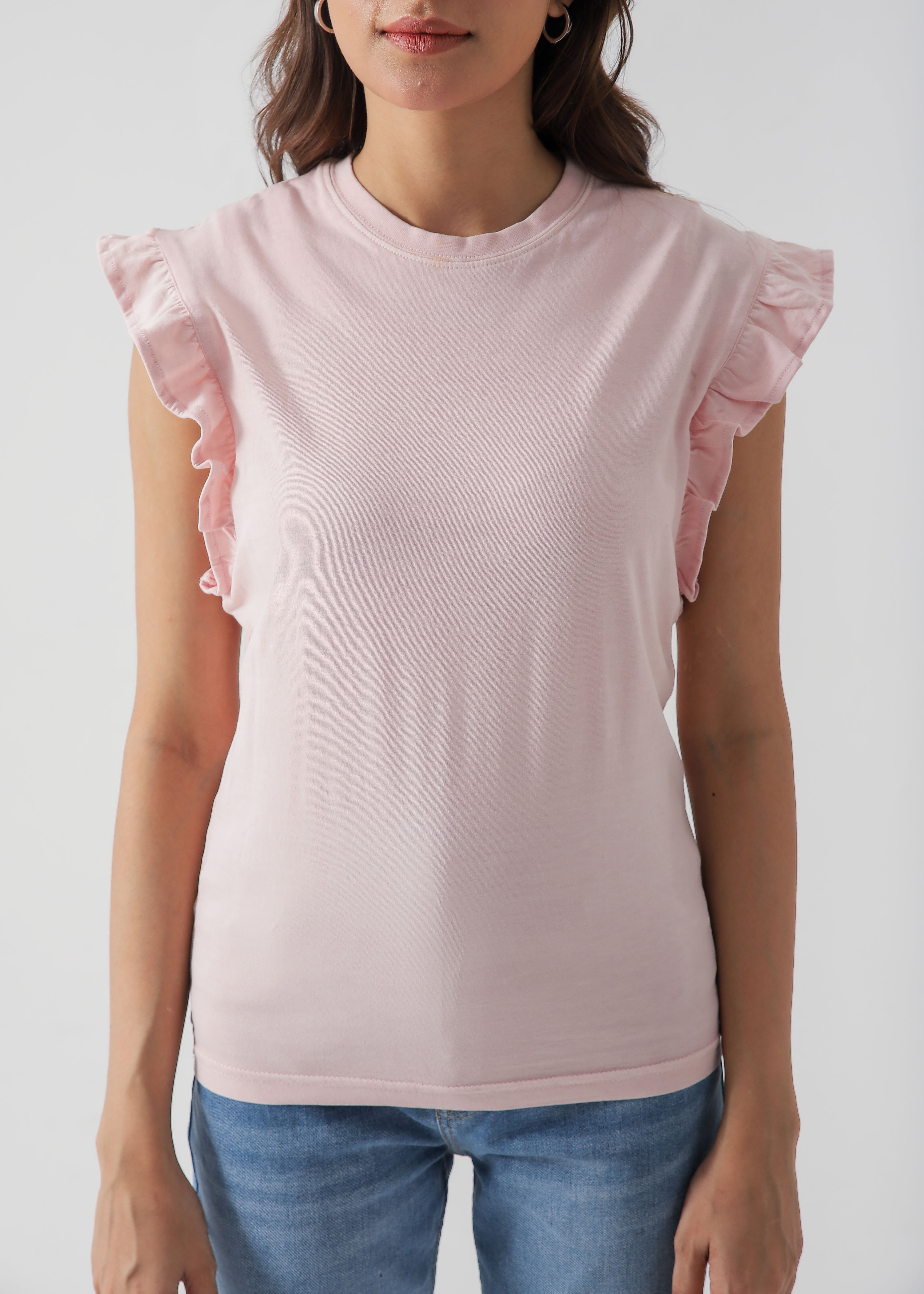 Soft, airy and breathable T-shirt made of 100% cotton round neckline and sleeveless with frills.