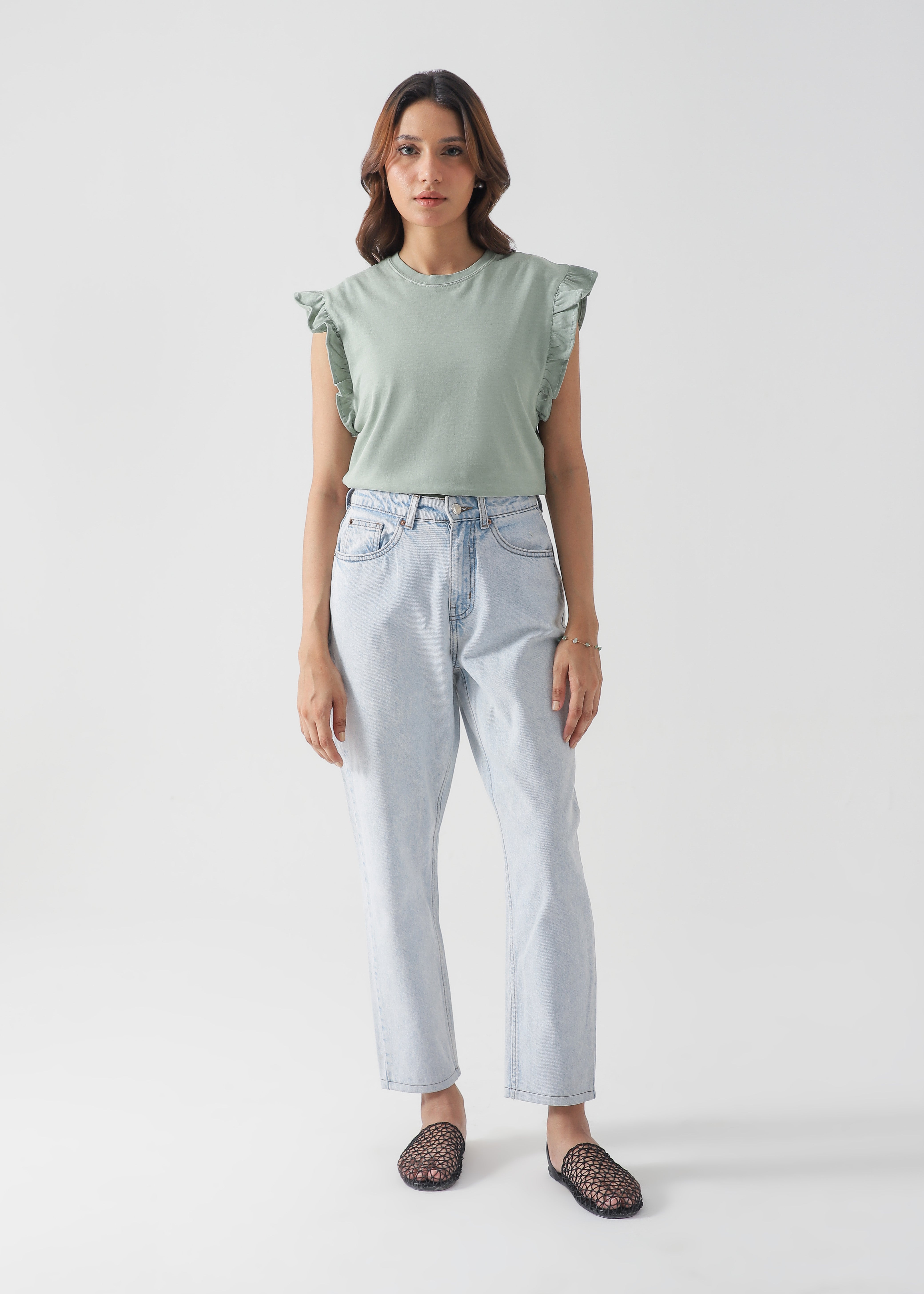 Soft, airy and breathable T-shirt made of 100% cotton round neckline and sleeveless with frills.