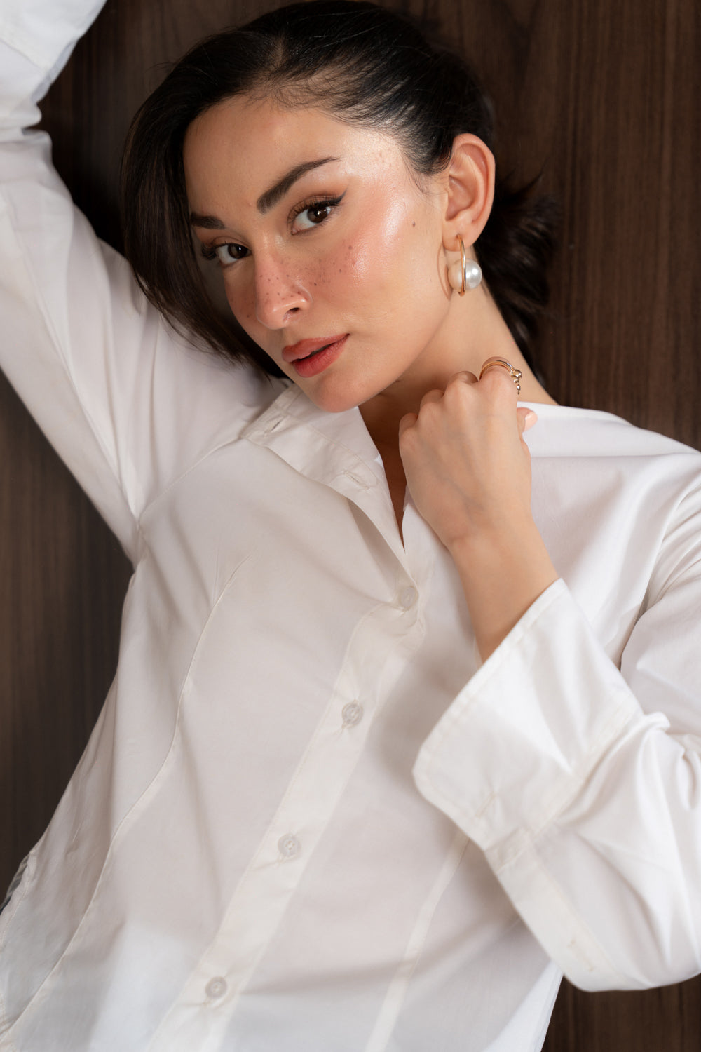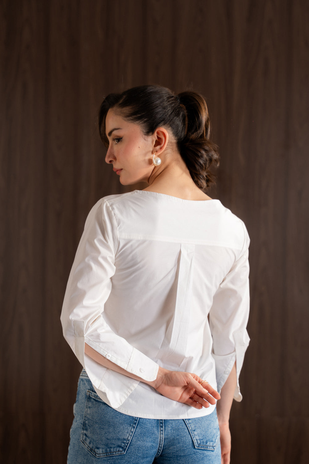 Crafted from crisp cotton, this modern piece is designed with a wide boat neckline in place of a traditional collar and is finished with buttons.