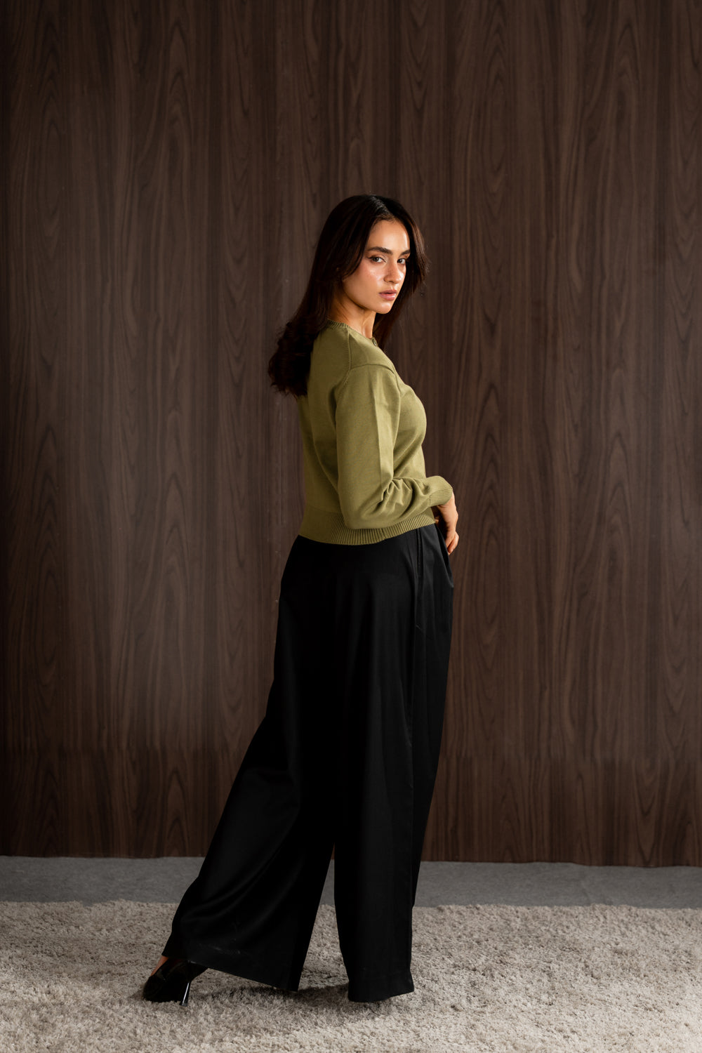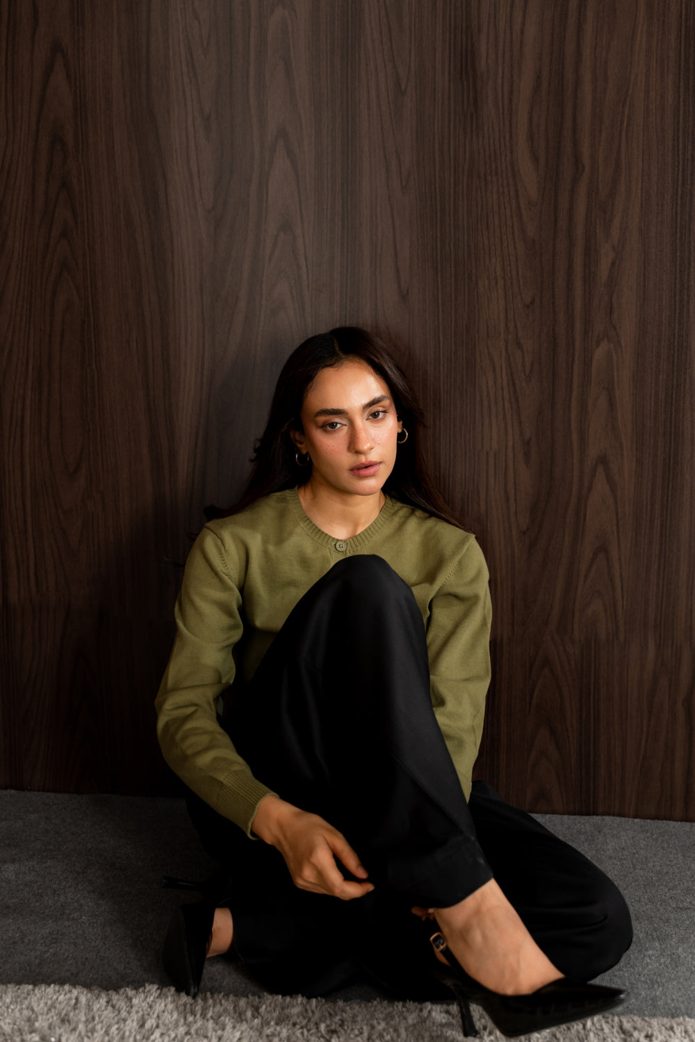 Cut in a relaxed shape, this piece is knitted from premium yarn with a more substantial hand feel. It is designed with a classic crew neck, ribbed trims.  -        cropped regular fit -        button closure  The model is 5’6" (170 cm) and is wearing a size XS.